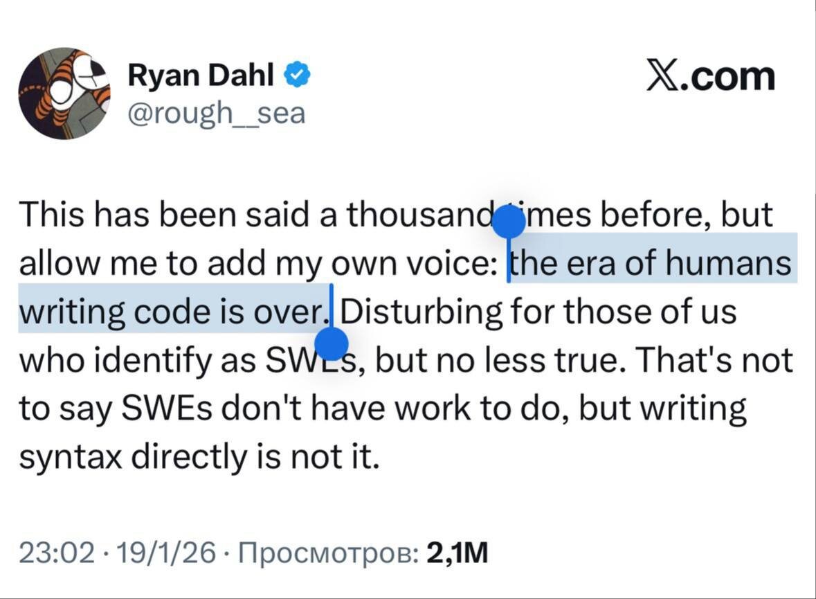 : Об этом говорилось уже тысячу раз, но позвольте мне добавить свой голос: эра, когда код писали люди, закончилась. Это тревожно для тех из нас, кто считает себя разработчиками программного обеспечения, но это так. Это не значит, что у разработчиков ПО нет работы, но написание синтаксиса напрямую — это не то, чем они теперь занимаются." Меня лично это не смущает абсолютно. Что думаете? Ампилов про ИТ: https://dzen.ru/id/623d938f380f3715018b6e3c