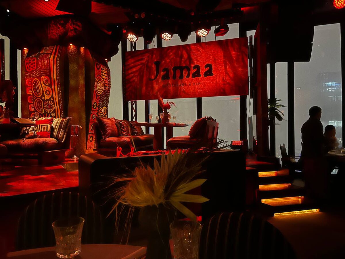 Вдохновленный африканской культурой и кухней ресторан Jamaa открылся на 84 этаже башни ОКО в конце прошлого года. Создатели — рестораторы Алексей и Дмитрий Васильчуки и шеф Александр Райлян, — обещают уникальную концепцию, основанную на идее общинности (собственно, jamaa с суахили и переводится как «община»), ну и, конечно, расширение гастрономических границ. Так что мы решили начать рабочий год с разведки этого экзотического места. Интерьер и атмосфера Само расположение играет ресторану на руку — подъем на 84 этаж отрывает тебя от привычного мира, так что погружение в самобытную культуру выходит полноценным. Дизайн современный, яркий (как и следовало ожидать), с большим количеством этнических мотивов. Открытию ресторана предшествовало путешествие владельца в ЮАР, так что многие элементы оформления — как, например, яркие африканские маски, украшающие стены и выполненный в форме национальной лодки коммунальный стол, — привезены оттуда. Ну, а шанхайские виды на мегаполис с высоты птичьег