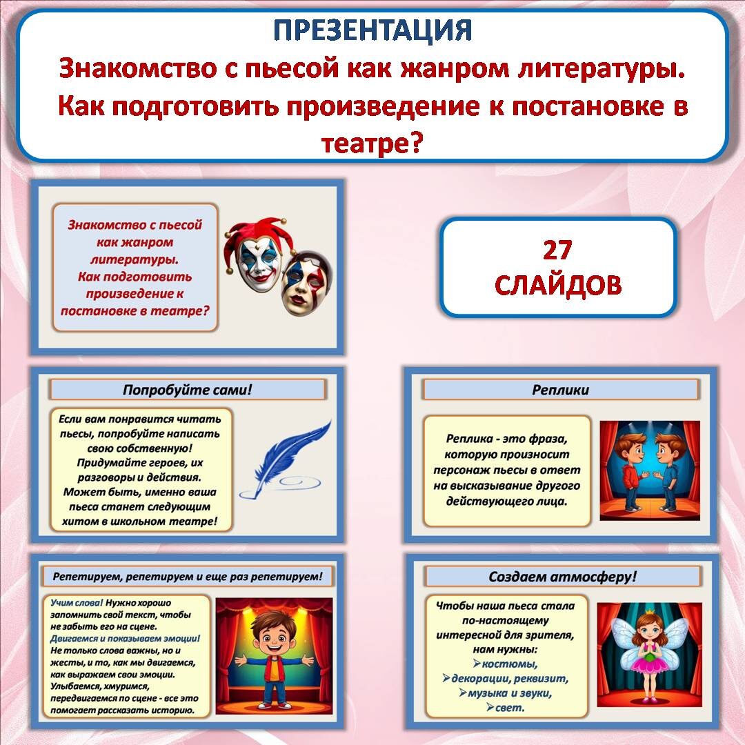 Презентацию скачать здесь Презентация «Знакомство с пьесой как жанром литературы. Как подготовить произведение к постановке в театре?» разработана к уроку литературного чтения в 4 классе. Презентация состоит из 27 слайдов. Учащиеся узнают: Учащиеся познакомятся с этапами подготовки произведения к постановке в театре. Содержание разработки носит не только обучающий, но и воспитательный характер. Данная презентация может пригодиться не только учителям начальных классов, но и руководителям театральных кружков. Материал изложен простым и понятным языком. Содержание презентации можно отредактировать и подстроить под цели вашего урока или уровень вашего класса. Желаю успеха!