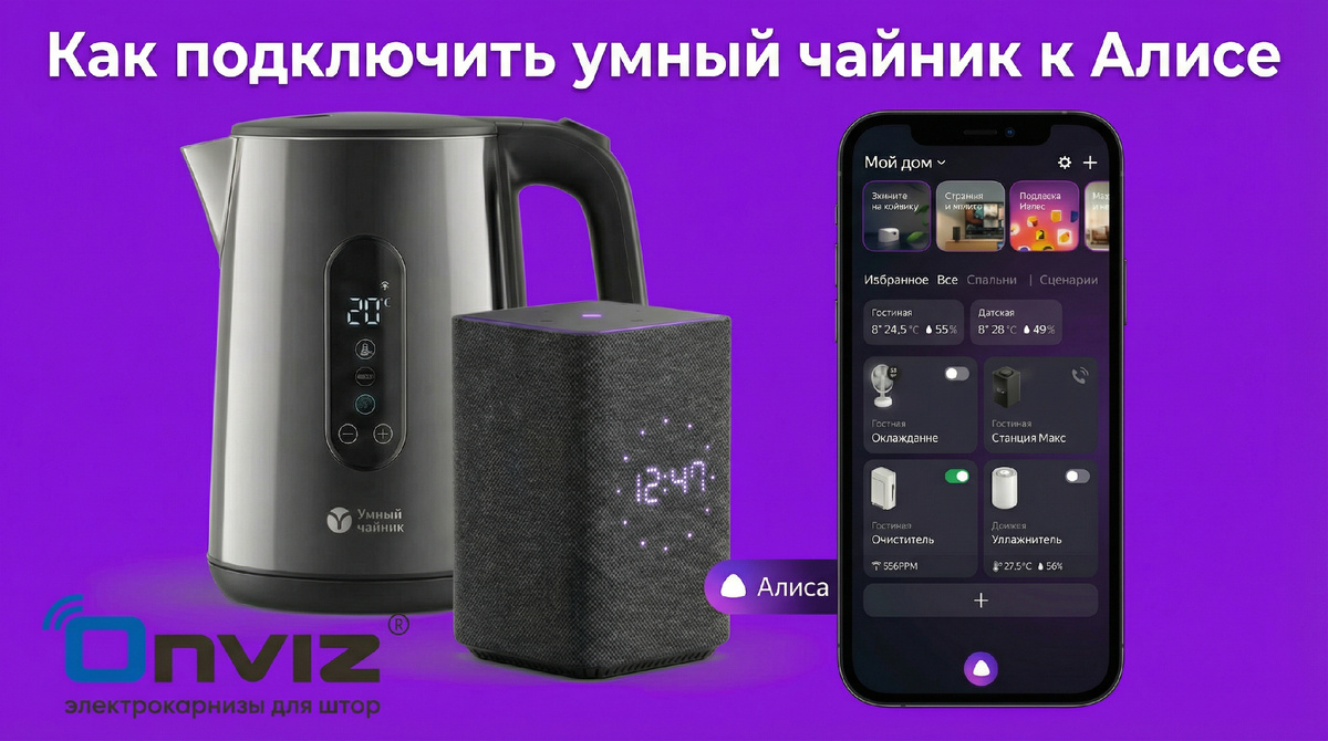 Вы купили крутой чайник с Wi-Fi, сказали ему: «Привет, Алиса, вскипяти воду», а в ответ — молчание. Как будто просите кота принести тапки. Знакомая история? Чаще всего проблема не в вас, а в чайнике, который не дружит с экосистемой Яндекса. Всё решается за 10 минут, если знать две вещи: 1. Проверьте «дружелюбие» чайника. У него должен быть именно Wi-Fi модуль (не просто Bluetooth) и поддержка работы со сторонними приложениями. Если инструкция об этом умалчивает — вот и причина диалога глухого с немым. 2. Выберите маршрут. Их два: После этого жизнь меняется: можно ставить чайник по будильнику, греть воду к вашему приходу с работы или, наконец, блеснуть перед гостями: «Алиса, порадуй нас чаем!». Кстати, про умный дом и голосовое управление мы в Onviz знаем всё, иначе не делали бы лучшие электрокарнизы на рынке. Наши карнизы подключаются к Алисе с первого раза и слушаются беспрекословно. «Алиса, открой шторы» — и утро начинается без усилий. Хотите такую же магию у себя дома? Узнать про