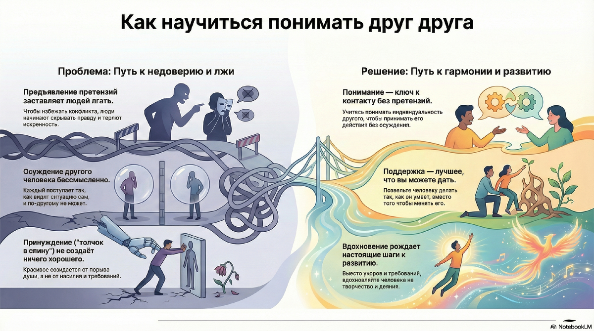 Приоритетная и вечная задача в любом общении — это научиться понимать друг друга. Но что на самом деле означает «понимать»? Это не простое согласие или одобрение. Это глубинное принятие индивидуальности человека, его личного видения мира и мотивов, которые им движут. Это признание его права быть собой и действовать в соответствии со своей внутренней правдой.