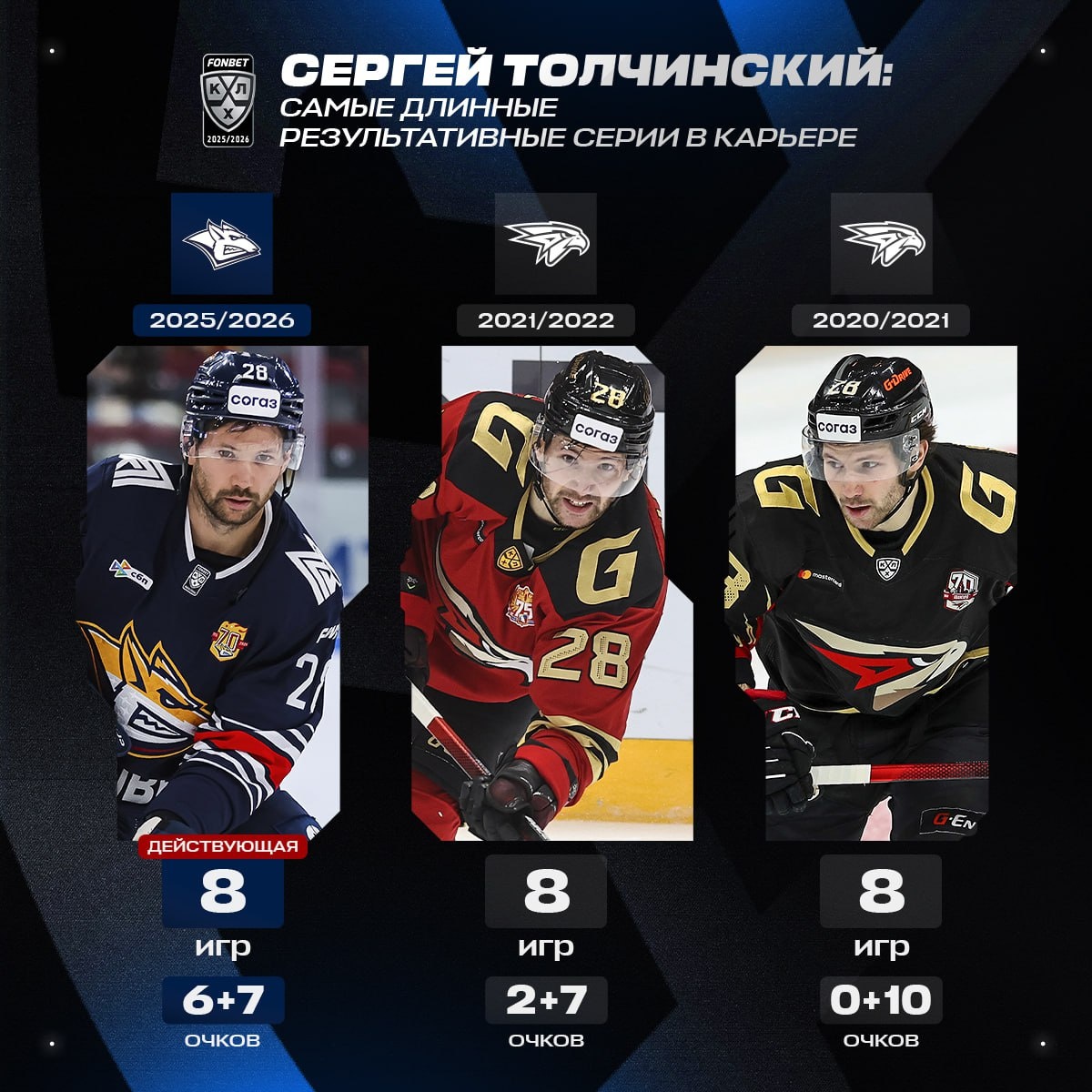 Сергей Толчинский находится в шаге от нового личного рекорда: еще ни разу в карьере Толчи не набирал очки в 9 играх подряд. Сделает ли он это сегодня?