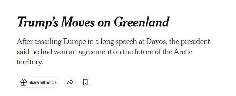 York Times. По информации издания, предложение предусматривает предоставление США суверенитета над ограниченными территориями Гренландии для строительства и эксплуатации военных баз. Генсек НАТО Рютте ранее сообщил, что провел "очень продуктивные" переговоры с Трампом по вопросам безопасности в Арктическом регионе. 🤗 НАСОНОВ 🔴