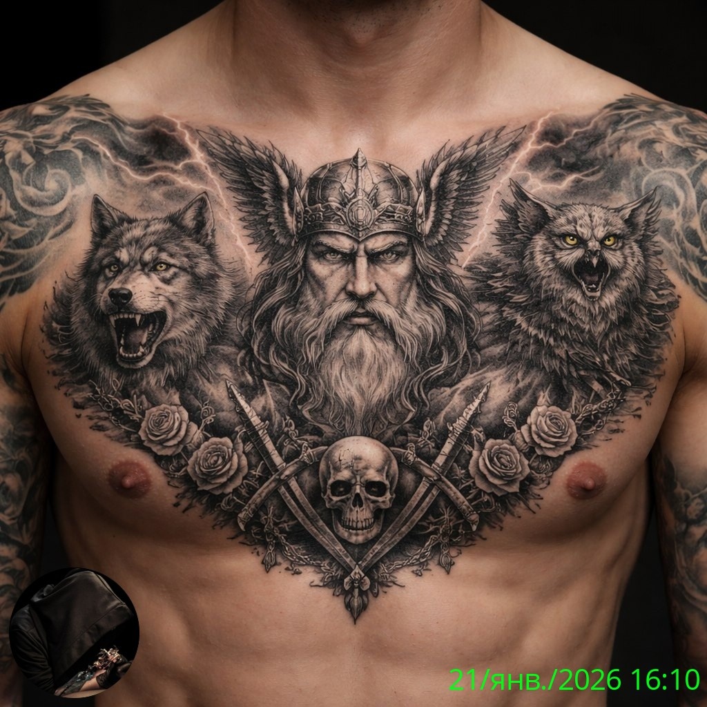 Татуировки викингов — это не просто украшение, а глубокий символ, отражающий философию силы, судьбы и верности. На представленном изображении мы видим композицию, которая объединяет несколько ключевых элементов скандинавской культуры.