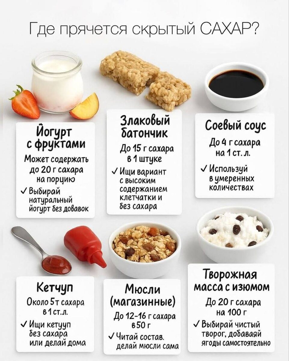 Сахар есть не только в десертах — он прячется в соусах, хлебе и даже «здоровых» перекусах. Узнайте, как обнаружить скрытый сахар в составе и не превысить дневную норму в 25 граммов (6 чайных ложек). Где прячется скрытый сахар: · Соусы и заправки — кетчуп, соус для пасты, майонез, барбекю · «Здоровые» перекусы — йогурты с наполнителями, мюсли, протеиновые батончики · Полуфабрикаты — колбасы, сосиски, готовые супы и блюда · Напитки — соки, спортивные напитки, холодный чай, диетическая газировка · Хлеб и выпечка — даже цельнозерновой хлеб и крекеры «без сахара» Как сахар маскируется в составе: Производители используют альтернативные названия: · Фруктоза, сахароза, мальтоза, декстроза · Сиропы: кленовый, топинамбура, агавы, рисовый, кукурузный · Патока, концентрат сока, карамель, меласса Практические советы: ✅ Читайте состав — если сахар в начале списка, его много ✅ Сравнивайте продукты — выбирайте варианты с меньшим содержанием сахара ✅ Готовьте сами — соусы, заправки и перекусы без