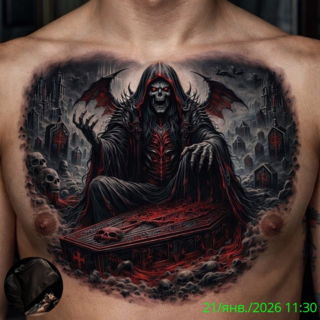 Татуировка, изображённая на фото, представляет собой мрачный и детализированный образ Смерти, сидящей на фоне готического города. Этот символ имеет глубокие корни в культуре и мифологии, а также множество интерпретаций.