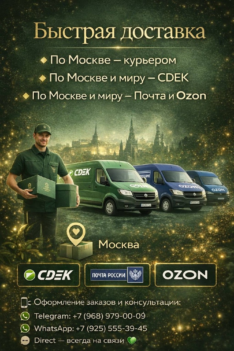 Мы сделали всё, чтобы получать любимые ароматы было максимально комфортно ✨ 🚀 Ozon — бесплатно от 3 000 ₽ Быстрая доставка в ближайший пункт выдачи Ozon по всей России. 🚚 Другие варианты доставки: • СДЭК / Почта по России — бесплатно от 5 000 ₽ (до 5 000 ₽ — 400 ₽) • Курьер по Москве (в пределах МКАД) — 500~1 000 ₽ ⚡️ • Удалённые регионы — рассчитываем индивидуально 📲 Оформление заказов и консультации: Telegram: +7 (968) 979-00-09 WhatsApp: +7 (925) 555-39-45 Direct — всегда на связи 💚 ✨ Пока ароматы в наличии — самое время пополнить коллекцию или выбрать идеальный подарок.