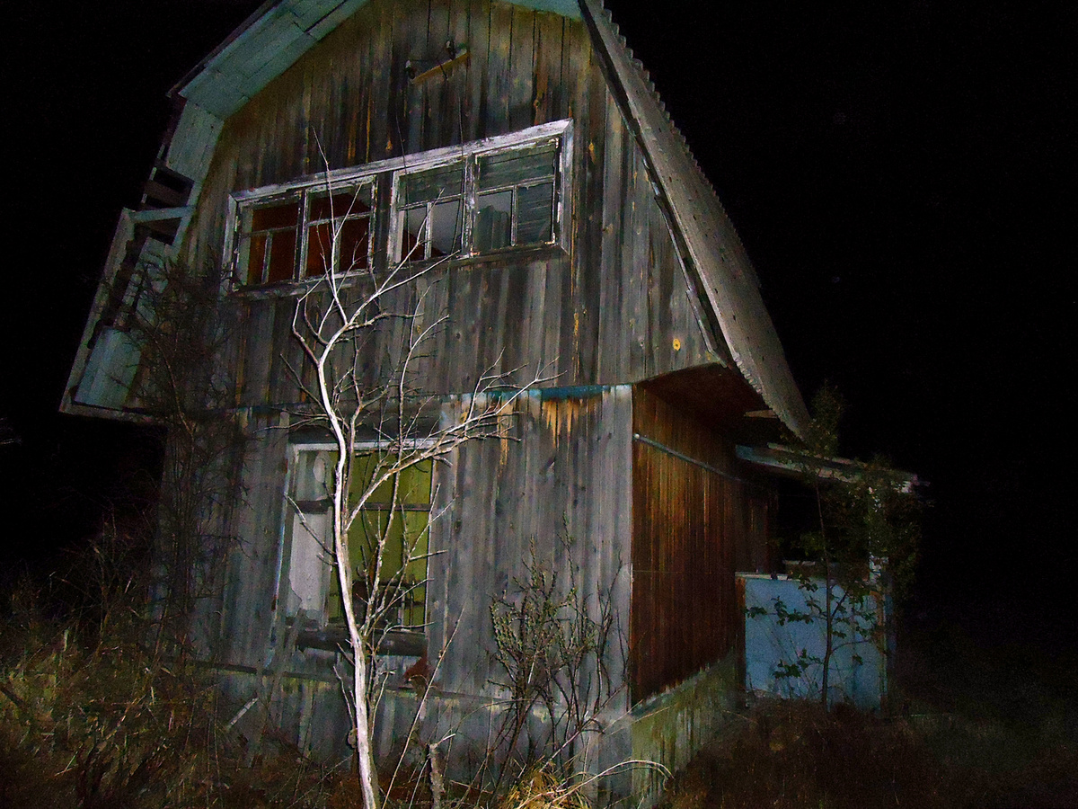 Тёплым летним вечером мы с друзьями отправились гулять по дачному обществу. На улице было уже совсем темно, но вокруг продолжала кипеть жизнь. На многих участках горел свет, и слышались весёлые голоса, а ветер периодически доносил до нас запах топящихся бань. Словом, вокруг царила какая-то приятная и умиротворяющая атмосфера, по которой порой так скучаешь долгими зимними вечерами… -О, смотри, заброшка! – неожиданно сказал мой друг, указывая в сторону. Повернув голову, я увидел одинокий домик, стоявший в темноте у дороги. Местами покосившийся и сломанный забор, выбитые окна, начавшая разваливаться крыша – судя по её виду, эта дача была заброшена уже достаточно давно. В отличие от меня, мои друзья не питали интереса к заброшенным местам, да и сам я, на тот момент, начал увлекаться ими относительно недавно, однако мы с любопытством направились к заброшенному дому. Дверь была не заперта. Зайдя внутрь, мы очутились в небольшой комнатке, где царил беспорядок. Было видно, что сюда уже не раз