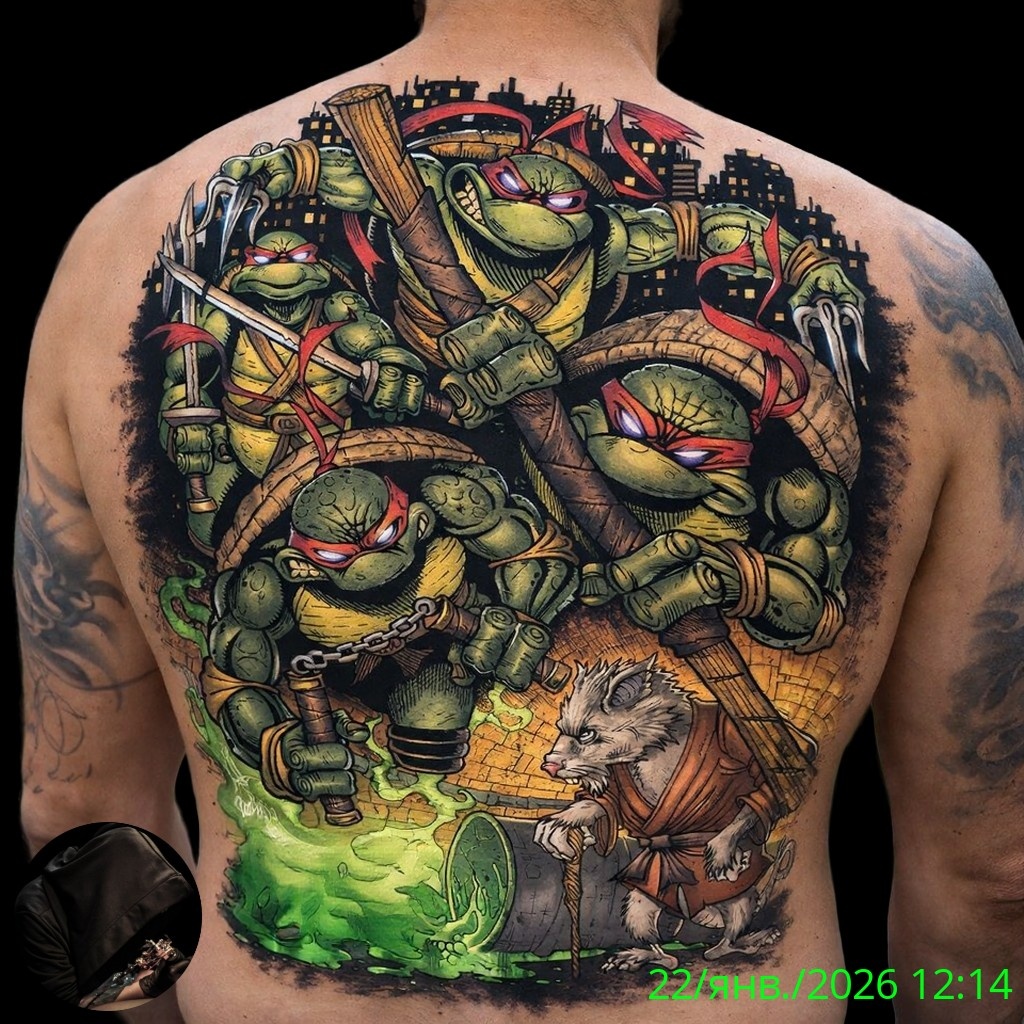 Татуировки с изображением Черепашек-ниндзя — это не просто дань популярной культуре, но и глубокое выражение идей, которые вдохновляют миллионы людей по всему миру. На представленном фото изображена динамичная сцена с четырьмя героями: Леонардо, Рафаэлем, Донателло и Микеланджело, а также их верным спутником — крысой Сплинтером.