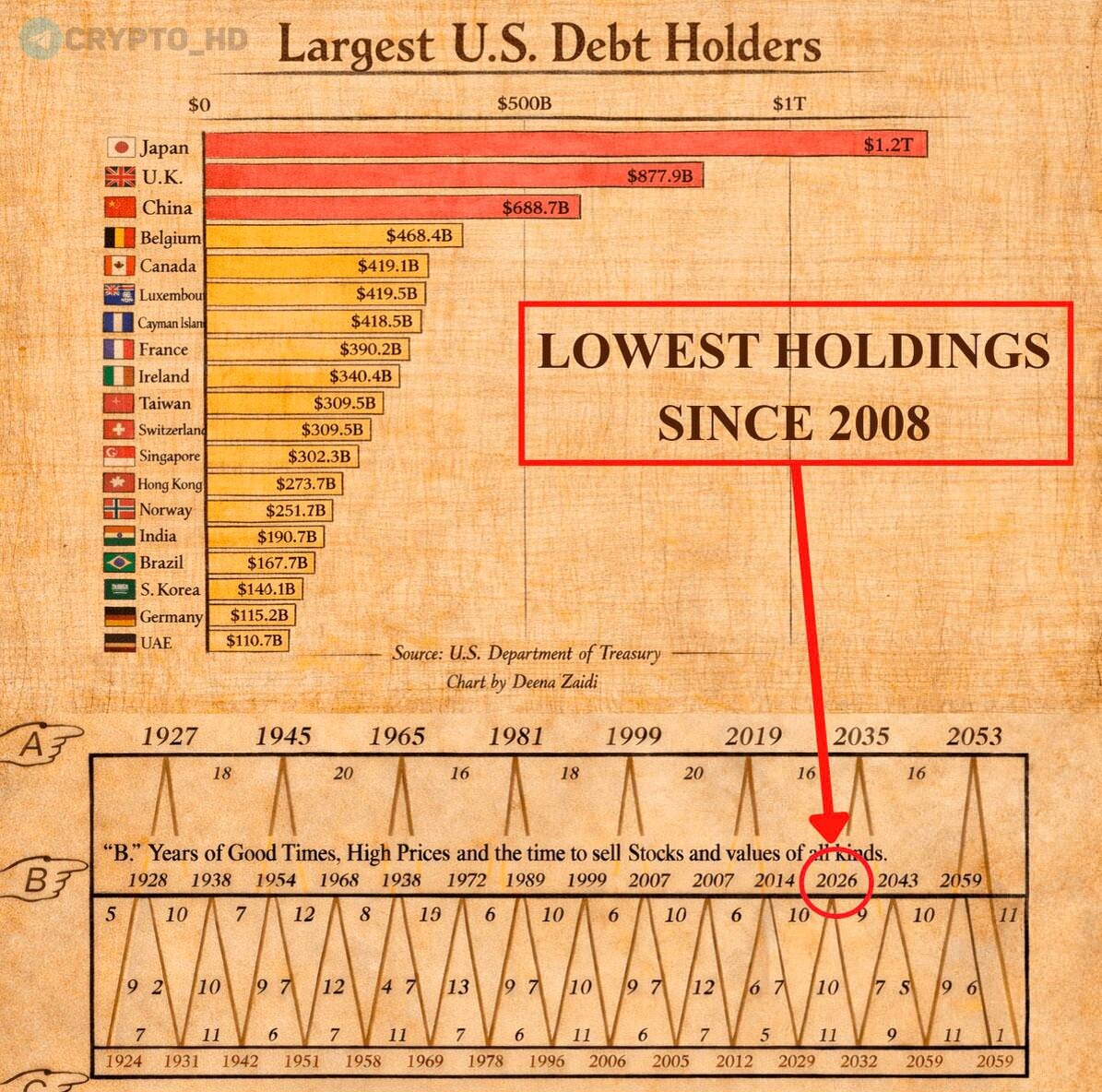 Страны массово сбрасывают трежерис: ▪Европа – $150,2b (рекорд с 2008 года). ▪Китай – $105,8b (рекорд с 2008 года). ▪Индия – $56,2b (рекорд с 2013 года). Трежерис – основа всей финансовой системы. Когда продают госдолг США, растет доходность гос. облигаций → дорожают деньги → сжимается ликвидность → рисковые активы под ударом. Цепочка реакций: первым страдает рынок облигаций → далее снижаются акции → самый жесткий удар приходится на крипторынок (original) Ранее: - Гаррет Джин - японский рынок облигаций Crypto Headlines