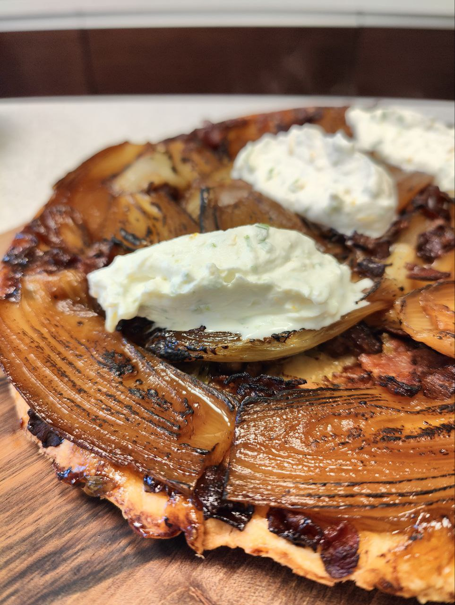 Французский пирог-перевертыш - очень быстрый рецепт! Весь пирог готовится в одной скотоводе, займет 15 минут вашего времени +20 минут для запекания и стол накрыт! Готовим вместе со мной пошагово и все получится. Приступим! 1) Бекон нарезаем и поджариваем. Выкладываем на бумажное полотенце, чтобы стек лишний жир. 2) В сковороде оставляем 1/3 жира от бекона. Добавляем 1 ст.л сахара и топим до карамели. Добавляем1 ст.л бальзамического уксуса, перемешиваем и