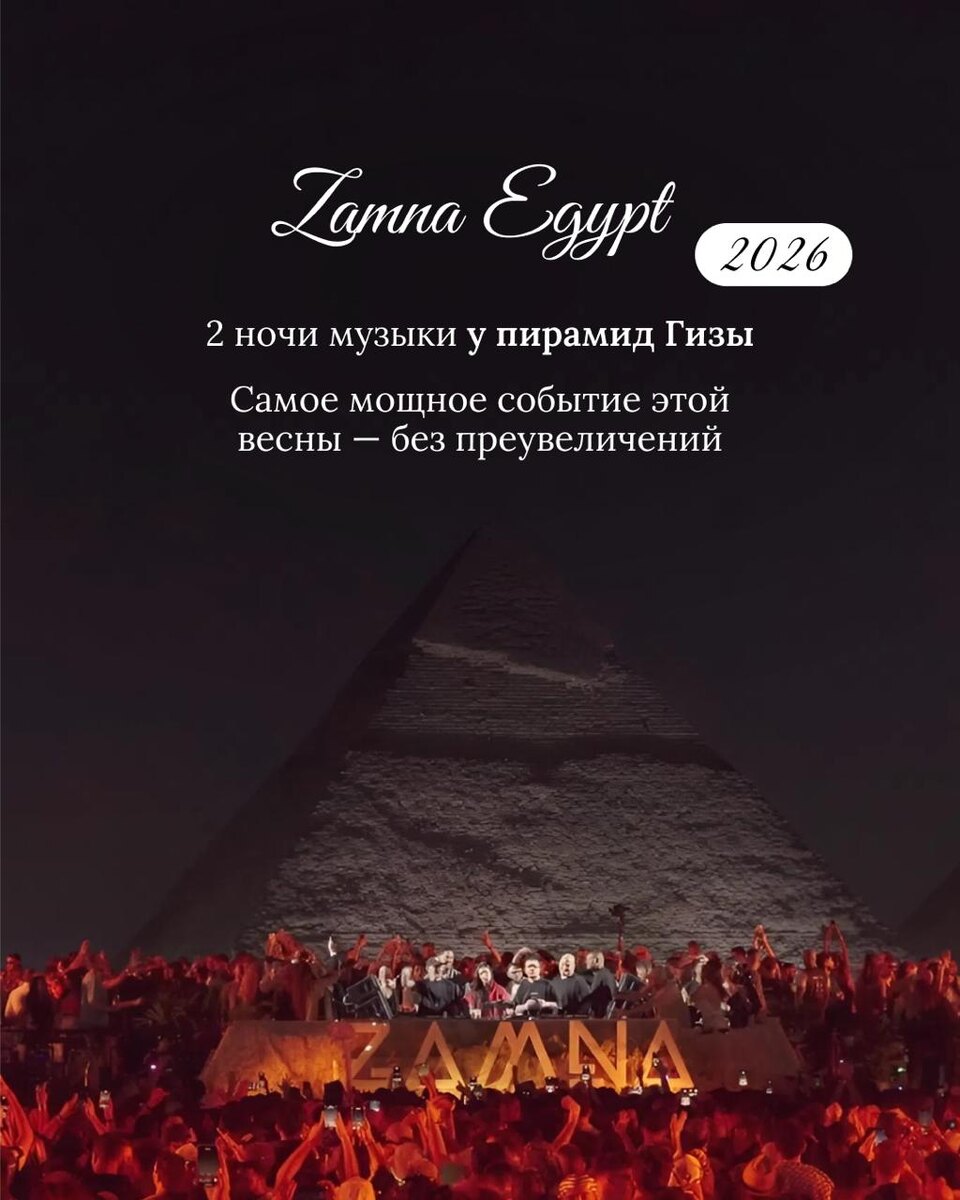 🔥 Если Египет для вас это только море и отель, то ZAMNA покажет совсем другой уровень 😍 Фестиваль возвращается после прошлого года, который называли легендарным, и снова проходит у подножия пирамид Гизы. Это целое путешествие: Каир днём, история и приключения, а ночью музыка, пустыня и незабываемая атмосфера. 📍 Где: The Great Pyramids Of Giza, Каир 🗓 Когда: 24–25 апреля 🕕 Время: 18:00 – 03:00 🔞 Возраст: 21+ Почему стоит поехать: ✅ Уникальная локация: фестиваль реально проходит рядом с пирамидами, это редкость мирового уровня ✅ 2 ночи мощного шоу: звук, свет, сцена и вайб пустыни под звёздами ✅ Формат “музыкальный отпуск”, а не один вечер: обещают больше артистов, больше программы, больше событий ✅ Каир как приключение днём: можно успеть город, рынки, музеи, атмосферу и древнюю историю ✅ Нил на закате: тот самый момент, когда хочется просто молча смотреть и кайфовать ✅ Сайд-ивенты по городу: pool parties, rooftops, after-parties — жизнь кипит не только на главной сцене ✅ Можно