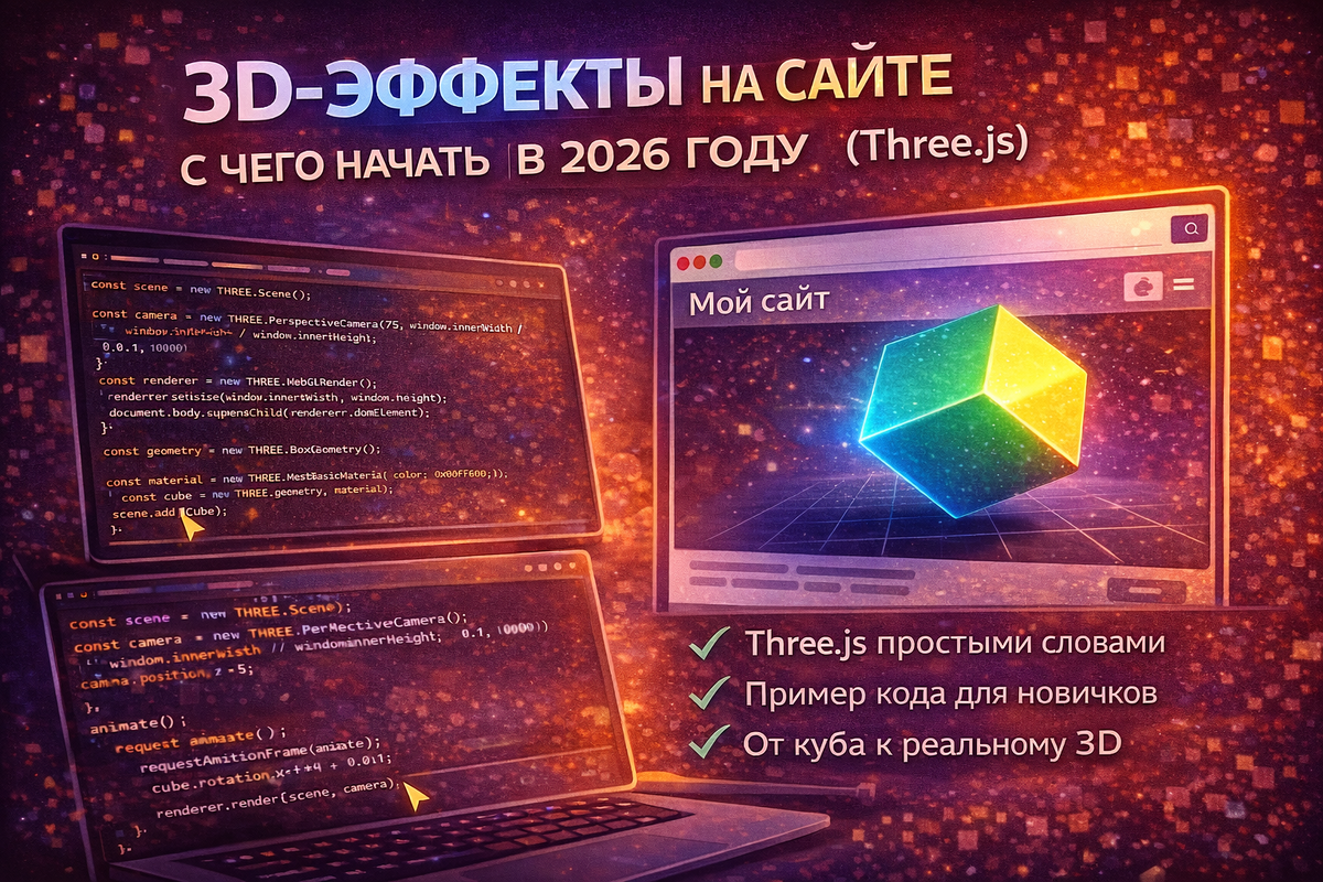 В 2026 году ситуация изменилась — 3D-элементы стали обычным инструментом фронтендера, а не экзотикой. В этой статье разберём: Без математики, без сложных терминов, шаг за шагом. 3D используют не «для красоты», а для задач: Примеры, где 3D реально используют: Важно: 3D — это не значит перегружать сайт. Часто достаточно одного аккуратного элемента. Three.js — это JavaScript-библиотека, которая позволяет создавать 3D-графику прямо в браузере. Если очень просто: 👉 Ты пишешь обычный JavaScript, а не сложный графический код. Любая 3D-сцена состоит из трёх основных вещей: Можно представить это как фотостудию: Начнём с минимального примера — вращающийся куб. HTML Мы создаём пустую 3D-сцену — контейнер, в котором будут все объекты. Если камеру не отодвинуть — объект будет «внутри камеры». Пока куб есть, но он ещё не отображается, потому что мы не запустили рендер. 👉 В итоге куб плавно вращае