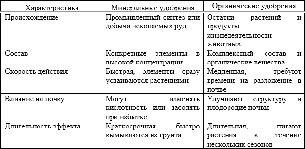 Таблица 1 – Различие минеральных и органических удобрений