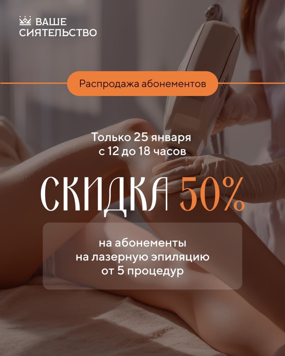 Первоуральске 🌿 Не пропустите! 💥 Скидка на лазерную эпиляцию – 50% при покупке от 5 процедур * Акция действует для всех клиентов * Действует только 25 января строго с 12:00 до 18:00 * Скидки и акции компании не суммируются Не упустите шанс позаботиться о себе с максимальной выгодой! 🎯 Количество абонементов ограничено. 💟 Для записи пишите прямо сейчас в https://dzen.ru/id/631dced52d0393190cc5f0df #вашесиятельство #эпиляциявашесиятельство