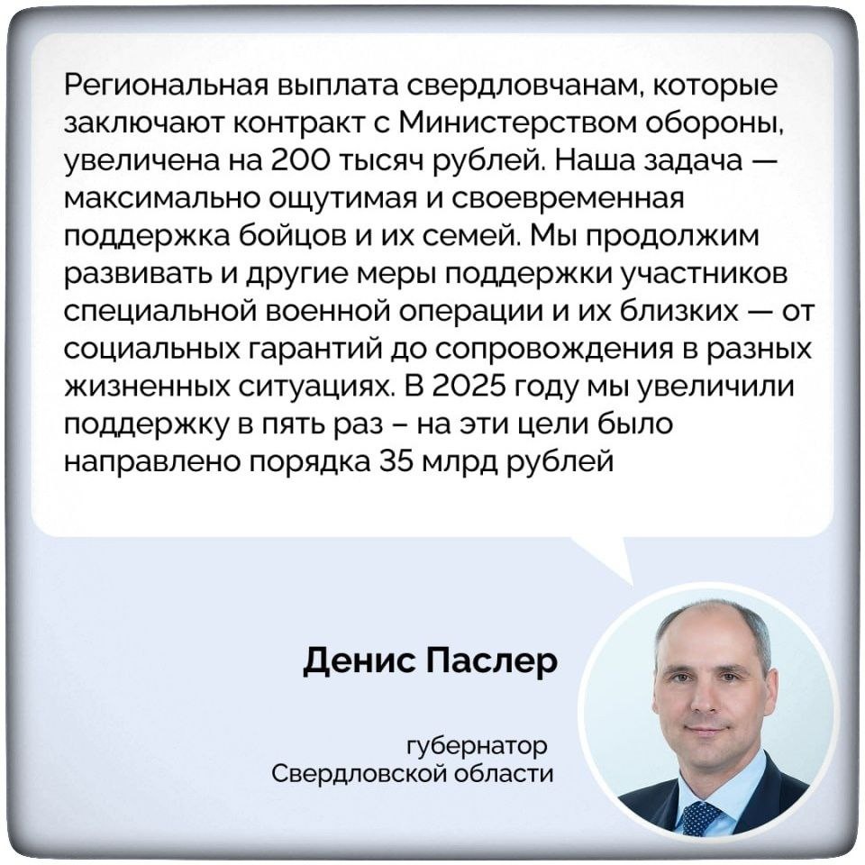 проведения специальной военной операции. Размер региональной выплаты увеличен до 2,7 миллиона рублей. Дополнительно военнослужащие получают 400 тысяч рублей в качестве федеральной единовременной выплаты от министерства обороны. Таким образом, совокупная выплата составляет 3,1 миллиона рублей. Кроме того, родные свердловчан, участвующих в спецоперации, продолжат получать единовременную выплату в 20 тысяч рублей на семью, а также аналогичную сумму на каждого из детей военнослужащего. В регионе также действуют и другие меры поддержки семей участников СВО, включая льготную газификацию жилых домов, отсрочку арендных платежей и расторжение договоров аренды без штрафных санкций, бесплатный отдых детей участников СВО в оздоровительных лагерях на Черноморском побережье и бесплатное питание для детей военнослужащих в школах и колледжах. Дзен | ВК | ОК | МТ | Телеграм