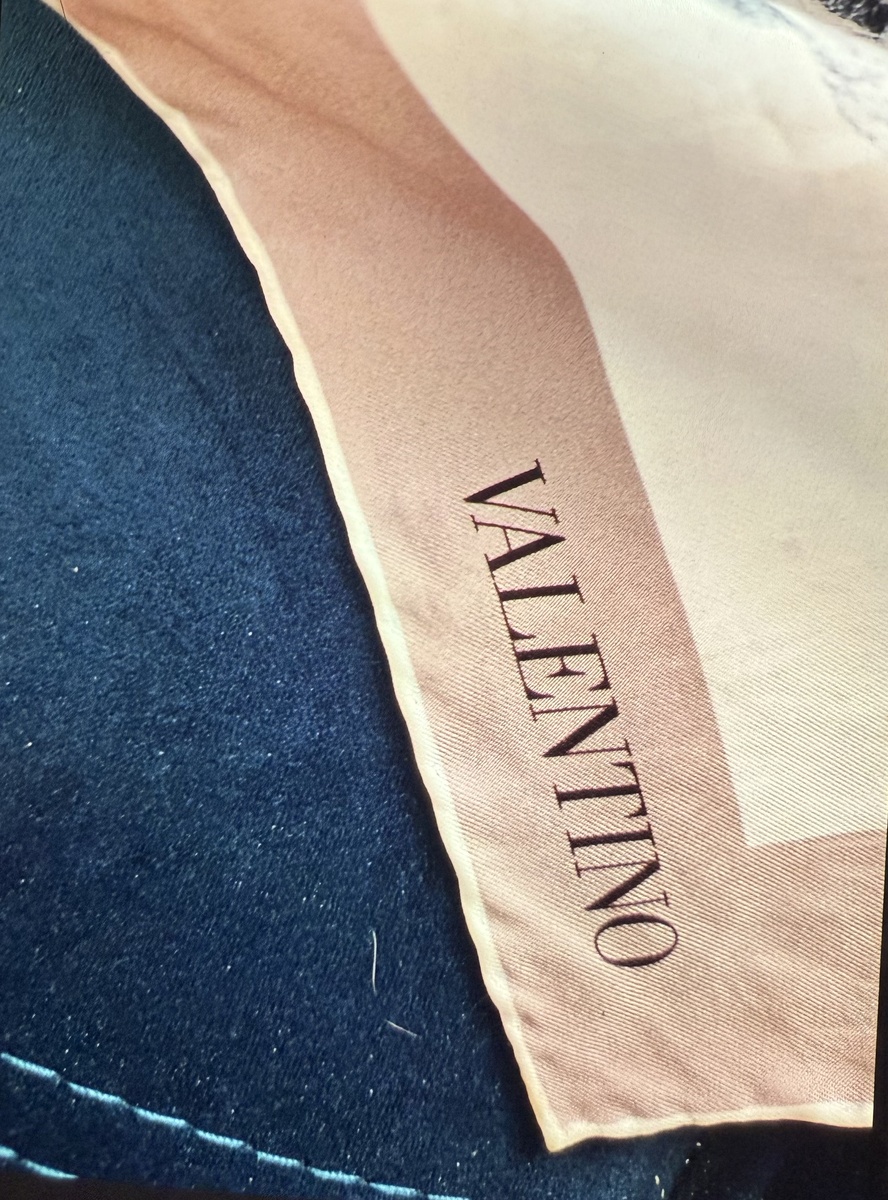 В этот раз нашла платок от Valentino в бежево-серых розах. Размер платка 90 на 90 см, подшит ручным швом.
