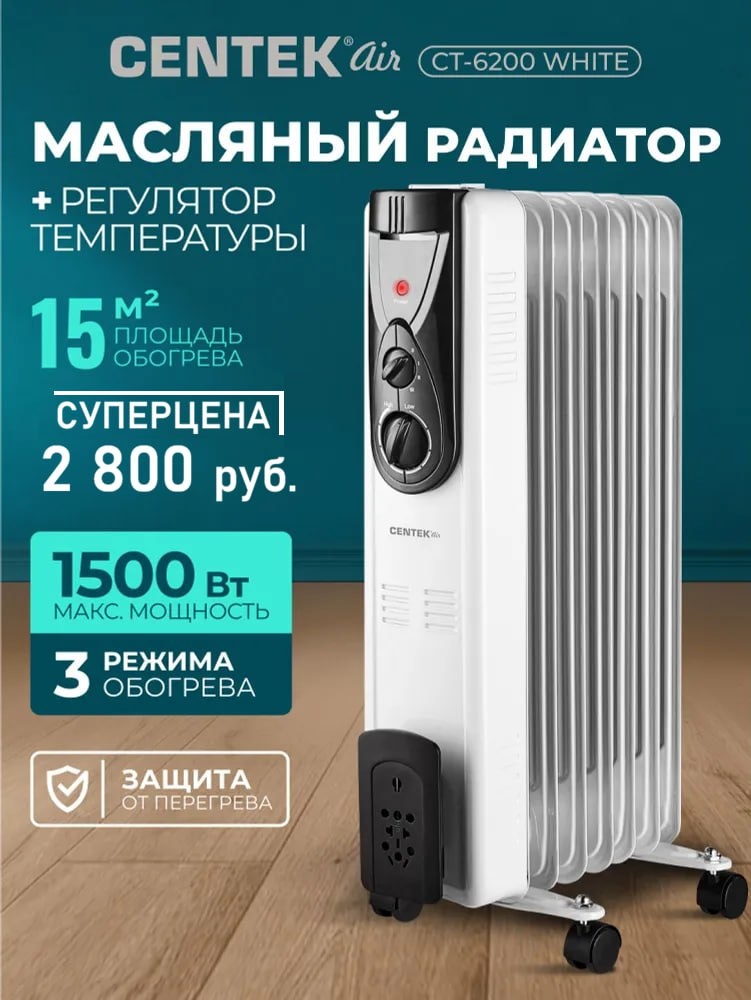✅ 🚩Масляный обогреватель CENTEK CT-6200 White — это идеальный выбор для создания комфортной атмосферы в вашем доме. С мощностью 1500 Вт и 7 секциями, он способен эффективно обогреть помещение площадью до 15 квадратных метров. Этот обогреватель обеспечивает равномерное распределение тепла и быстро создает уют в вашем жилище. 🚩 Суперцена - 2800 руб. 🟢 З режима работы - 700 / 1000 / 1500 Вт 🟢 Терморегулятор 🟢 Защита от перегрева 🟢 Площадь обогрева - 15 м2 🟢 Ножки в комплекте 📱Телефон: +7 (949) 301-08-41