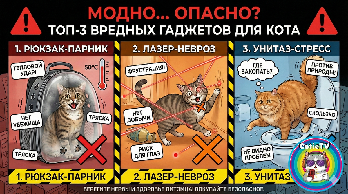 Мы любим своих пушистых и хотим для них самого лучшего. Этим пользуются производители, предлагая нам «инновационные» товары. На картинке — космос, в отзывах — восторги (часто накрученные), а на деле — стресс и риск для здоровья. Вот «черный список» модных аксессуаров, которые я бы не советовала покупать, даже если они выглядят очень стильно. 1. Рюкзак с иллюминатором («Космонавт») Вы точно видели их на улицах: пластиковый рюкзак с прозрачным куполом, а внутри сидит кот с круглыми глазами. Смотрится футуристично, фото получаются — огонь. В чем подвох? 1. Парник. Летом внутри такого рюкзака температура поднимается за считанные минуты. Вентиляционных отверстий там обычно мало, и они маленькие. Кот сидит в пластиковой бане. Тепловой удар в таких «капсулах» случается пугающе часто. 2. Нет убежища. Кошка чувствует себя в безопасности только тогда, когда может спрятаться. В обычной переноске есть темные углы. Здесь она у всех на виду, как рыба в аквариуме. Собаки лают, машины гудят, люди тыч