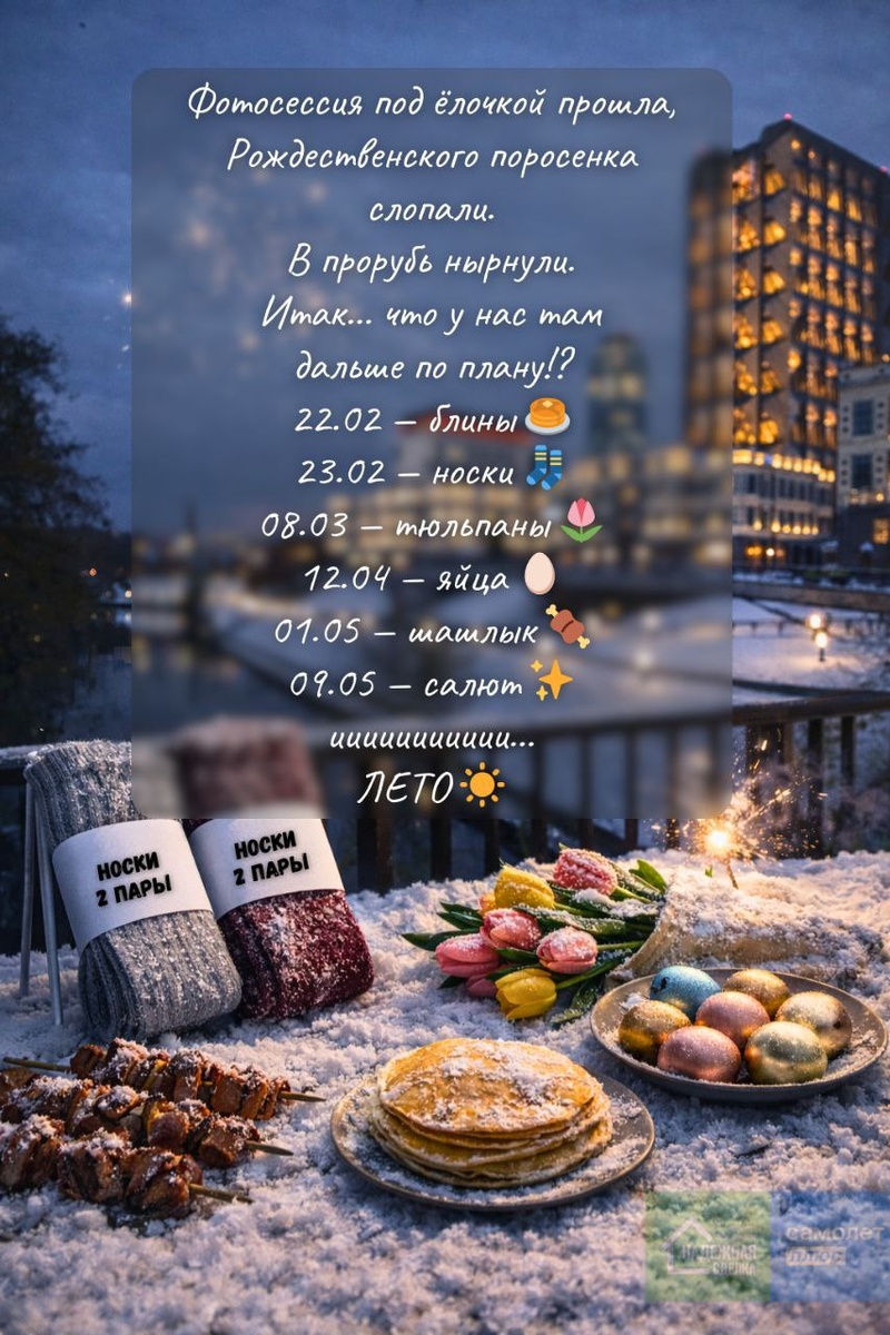 🙂Если оливье со сметаной — значит зима, если с квасом — лето. Прошли века... Календари есть у всех. Напоминания, планеры, а привычки-то остались😂 🤔Итак… что у нас там дальше по плану? Блины → носки → тюльпаны → яйца → шашлык → салют… ииииииии лето ☀️ #евгенияказанцева #мемдня #такбывает #носкиитюльпаны #пасха #времягода #календарьжизни #летоскоро