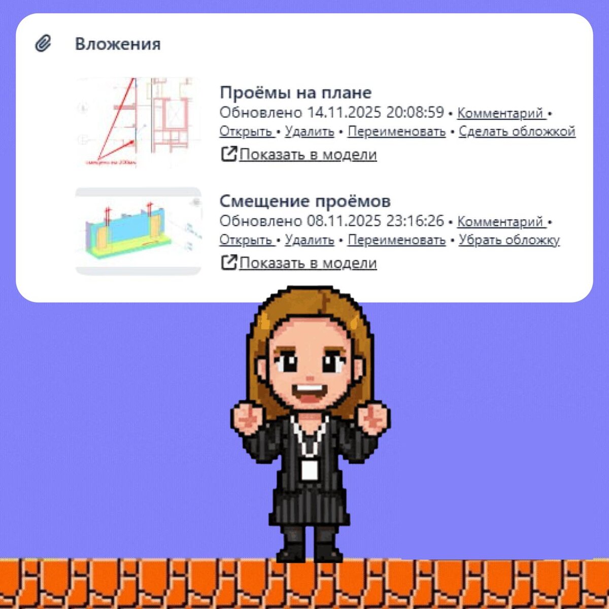 Для нас в бесспорном выигрыше «Показать в модели». Мы стали гораздо меньше уставать, когда её реализовали. Вместо цепочки из 50 шагов – остался один. Клик по картинке во Вложениях → и сразу видно контекст в модели. Без поиска осей, уровней и «а где это вообще». Снимок должен быть сделан скриншотером Future Cap🙌Именно он умеет сохранять не только 2D-информацию, но и данные о положении камеры Revit