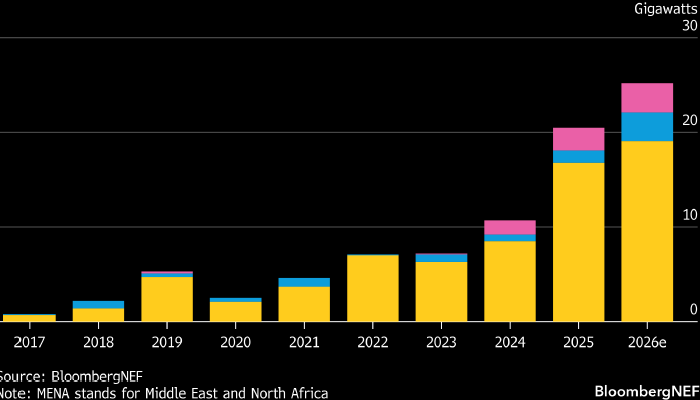 Страны региона активно наращивают генерацию «зеленой» электроэнергии, чтобы стать стратегическим хабом для энергоемких отраслей промышленности, пишут аналитики BloombergNEF. Ежегодный прирост совокупной установленной мощности солнечных электростанций (желтым), ветрогенераторов (голубым) и систем накопления энергии (розовым) в регионе MENA. Источник: BloombergNEF По итогам 2026 года совокупная установленная мощность солнечных электростанций, ветрогенераторов и систем накопления энергии в регионе MENA (Ближний Восток и Северная Африка) вырастет на 25 ГВт (+23% г/г) прогнозирует BloombergNEF. По мнению аналитиков компании, это говорит об ускорении энергоперехода в регионе. Основной рост здесь будет обеспечен крупными проектами, реализуемыми в Саудовской Аравии, ОАЭ и Египте. Страны MENA активно наращивают генерацию «зеленой» электроэнергии, стремясь сократить потребление ископаемого топлива и стать стратегическим хабом для энергоемких отраслей промышленности, пишут аналитики BloombergNEF.