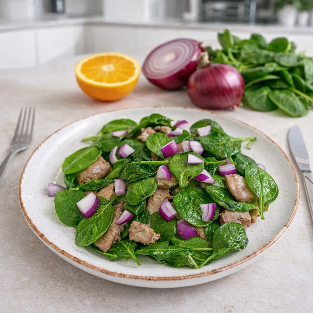 В очередной раз насладившись сочетаниями вкусов этого самого простого в приготовлении блюд из печени, у меня возникло ощущение абсолютной невозможности не рассказать о нем. Начнем с ингредиентов, их всего четыре: Куриная печень 500 гр Листья шпината 125 гр (стандартная упаковка) Один немаленький апельсин Половина красного сладкого лука (сладкий белый тоже подойдет, но с красным выглядит красивее) Печень необходимо взять именно куриную, она обладает как самым нежным вкусом, так и самой нежной текстурой - в этом блюде ее консистенция почти не будет отличаться от мусса. Приступим. Из апельсина следует выжать сок (самый простой способ – разрезать пополам и вращать столовую ложку внутри половинки), добавить его в слегка разогретую на медленном огне сковороду, где уже тает одна столовая ложка сливочного масла, присолить, добавить столовую ложку сахара (или любой сироп) и оставить неторопливо увариваться, помешивая время от времени. Если жидкость сильно выпариться, можно добавить немного бело