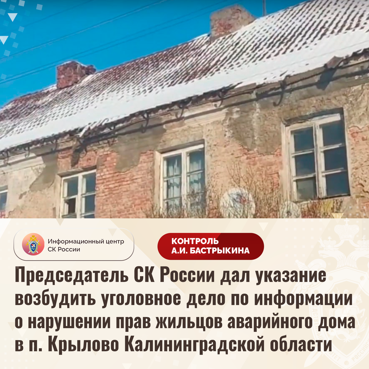 Председатель СК России дал указание возбудить уголовное дело по информации о нарушении прав жильцов аварийного дома в п. Крылово Калининградской области В социальной сети сообщается о нарушении прав жильцов многоквартирного дома в поселке Крылово Калининградской области. Несущие конструкции и кровля здания 1945 года постройки разрушаются, в стенах образовались трещины. Несмотря на признание строения аварийным в ноябре 2024 года, благоустроенное жилье гражданам не предоставлено, сроки расселения не сообщаются. При этом профильные структуры принуждают жильцов произвести снос строения самостоятельно. Собственники, опасающиеся полного обрушения здания, за исключением 88-летней пенсионерки, вынуждены арендовать другое жилье за свой счет. Многочисленные обращения в различные инстанции результатов не принесли. В СУ СК России по Калининградской области организована процессуальная проверка. Председатель Следственного комитета Российской Федерации Александр Иванович Бастрыкин дал указание руков