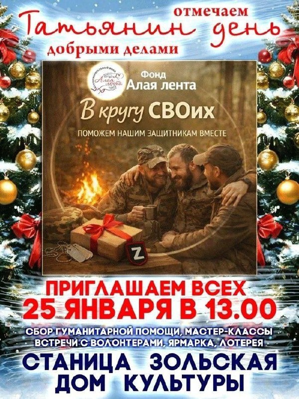В этом году мы хотим провести его в кругу СВОих друзей. Приходите на благотворительную встречу волонтёрских групп. Здесь вы сможете передать гуманитарную помощь для бойцов на СВО, помочь собрать посылки, написать письмо или сделать открытку, сувенир — не большое, но очень важное дело, которое согреет кого-то на передовой. Вы познакомитесь с волонтёрами, которые каждый день занимаются сбором и отправкой помощи. Они расскажут, что сейчас особенно нужно, как организована работа и как к ней присоединиться — даже если вы никогда раньше этого не делали. В перерывах между сборами и разговорами прозвучит небольшой концерт: наши друзья споют песни о доме, надежде и том, что нас объединяет. Также будет благотворительная лотерея — все средства от неё пойдут на помощь бойцам. А так же выставка-ярмарка, подготовленная нашими волонтерами. Приходите — не потому что «надо», а потому что хочется быть рядом, сделать что-то хорошее вместе и отметить Татьянин день по-настоящему: с теплом, смыслом и лю