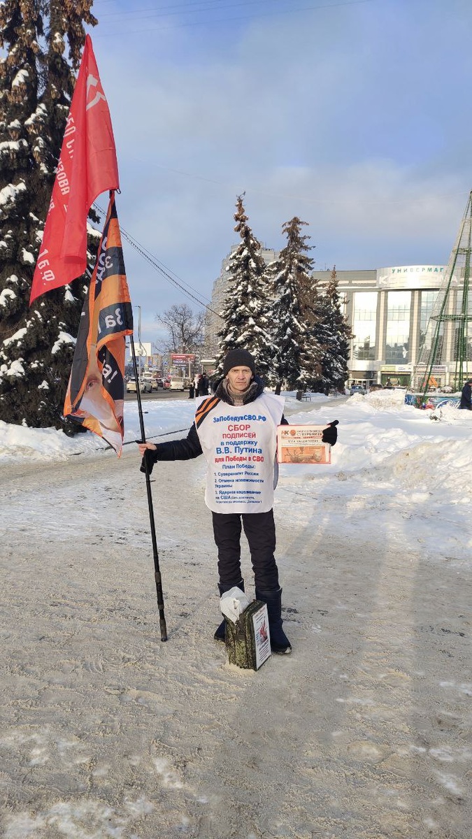 22.01.2026 НОД Кострома.Мочалов Юрий провел одиночный пикет возле универмага Кострома.За 2 ч.роздано 60 газет "Национальный Курс".Собраны подписи за расследование событий 1991г и за черезвычайные полномочия Путину.
