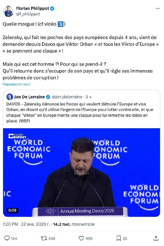 Лидер французской правой партии "Патриоты" Флориан Филиппо возмутился оскорбительными словами Зеленского в адрес Орбана "Какая надменность! Зеленский, который последние четыре года обворовывал страны Европы, только что потребовал в Давосе, чтобы Виктор Орбан и "все Викторы Европы" получили "подзатыльник"! Да кто этот человек?! Кем он себя считает? Пусть он вернется в свою страну и разберется с ее огромными проблемами с коррупцией!" - написал Филиппо в сети Х. 🔴 Читайте Sputnik Беларусь в MAX