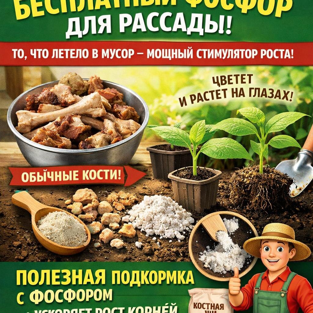 🔥 Бесплатный фосфор для рассады: то, что летело в мусор - мощный стимулятор роста из обычных костей! (Тайна, которую знали наши прабабки, а наука подтвердила только сейчас. Как превратить куриные кости в «золото» для корней.) ❌ ВСЕ ВРУТ! Реклама твердит, что фосфор — это только суперфосфат, аммофос и прочая «химия» из магазина. Но подлинный, биодоступный, органический фосфор уже есть у вас дома. Вы его просто выбрасываете после супа. Открытие: Фосфор из костей усваивается растением на 90%, а из минерального удобрения — на 20-40%. И это не просто питание — это гормон роста для корневой системы. Это природный фосфорно-кальциевый концентрат в форме гидроксиапатита. Плюс целый набор микроэлементов: магний, натрий, калий, железо, цинк.