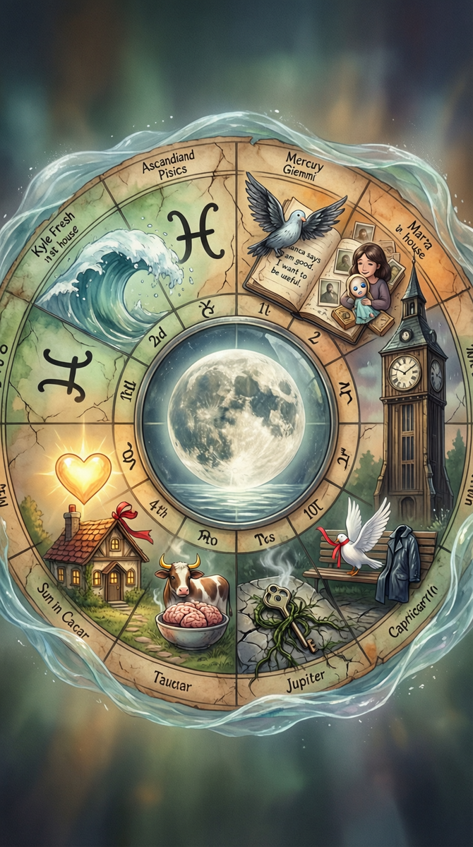 Чтобы лучше познакомится с моим зомби Фрешем, я решила создать для него натальную карту. Итак, приступим, что это у нас за зверь. Уран в Водолее (11-й дом): принадлежит к маргинализированной группе (зомби). Плутон в Скорпионе (8-й дом): фактически пережил смерть и перерождение. Нептун в Козероге (10-й дом): идеалист в обществе; доверяет системе, даже когда они его немного подводят и превращают в зомби. Меркурий в Близнецах (3-й дом): любопытный, разговорчивый, стремится узнать правила человеческого общества; пишет дневниковые записи. Венера в Раке (4-й дом): любит через заботу, романтичный и нежный. Марс в Весах (7-й дом): неагрессивный, стремится к гармонии; проявляет напористость только при защите близких (например, когда спасал Бьянку). Юпитер в Скорпионе (8-й дом): тянется к скрытым истинам. Сатурн в Козероге (10-й дом): обременен ответственностью, несмотря на наивность. Ну и самое главное: Асцендент в Рыбах (1-й дом): мечтательный и чуткий. Солнце в Раке (4-й дом): заботливый, тос