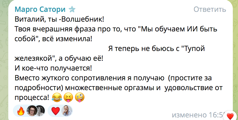 Вот такую обратную связь получили от участницы Мастер-Группы Марго Сатори. Не в бровь, а в глаз, правда? А в какой момент с вами произошло (и произошло ли) то самое «переставание сопротивляться»? Вот эти любимые психологические стадии уже пройдены? - Отрицание, гнев, торг, депрессия? Принятие произошло? Если вспомнить, как развивались события, можно проследить четкую парадигму отношения к ИИ с точки зрения рынка. Сначала, да еще год назад буквально (!), он был чем-то вроде игрушки, никто до конца не осознавал бесконечных способностей это штуковины. Никто не понимал до детальной конкретики, что такого мощного может сотворить ИИ при умелом управлении, никто не мог представить, как в моменте перекроИтся рынок, как эксперты будут бежать фактически по горящему мосту, чтобы не остаться за «бортом» - сделал шаг, а сзади уже всё обвалилось - будешь бежать - выживешь, остановишься - летишь вниз. Слишком быстро всё случилось, сопротивление по прежнему осталось, мозг никак не перестроится и помоч
