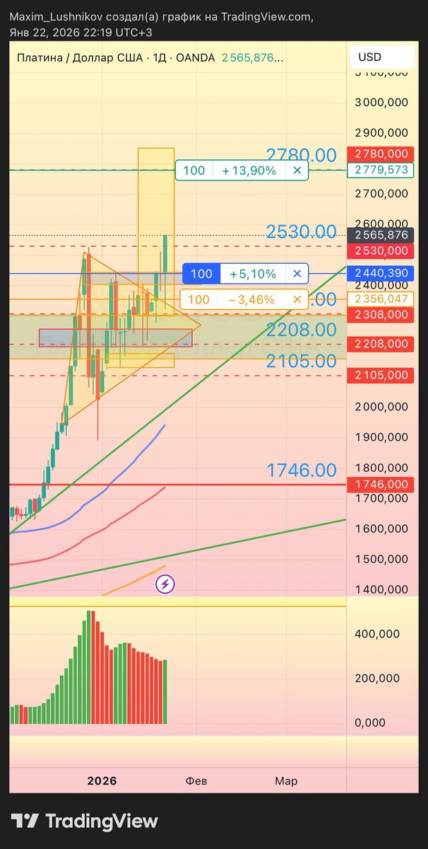 ⚪️ XPT/USD (Платина) 2 часть Платина обновило исторический максимум 2530 и сейчас летит к цели 2780. Сделку перевел в безубыток. ⚠️ Не является инвестиционной или торговой рекомендацией. Материал носит информационный характер.