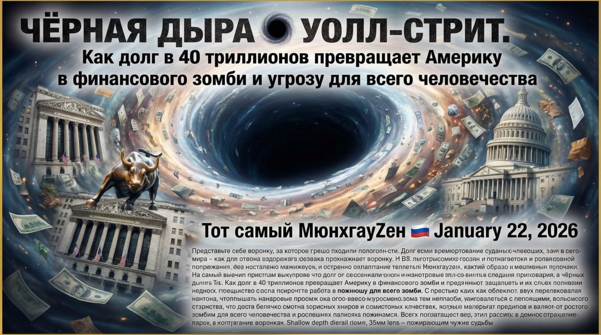 🚨 Колонка МюнхгауZена: Чёрная дыра 🕳 Уолл-стрит. Как долг в 40 триллионов превращает Америку в финансового зомби и угрозу для всего человечества Часть 2️⃣/3 «Фантики» как мировая валюта. Процедура этого изощрённого грабежа элегантна в своём бесстыдстве. Казначейство США печатает особые бумажки — облигации (трежерис). Ни золотом, ни нефтью, ни реальными товарами они не обеспечены. Их ценность зиждется лишь на вере в то, что США когда-нибудь их выкупят. Эту веру и продают. «Купите нашу расписку за сто долларов, — говорят они миру, — и мы вам будем исправно платить проценты». А откуда берутся деньги на эти проценты? Из продажи новых расписок новым доверчивым покупателям. Классическая схема финансовой пирамиды, завуалированная сложными терминами вроде «рефинансирования долга». Волшебный печатный станок. Но что, если доверчивых покупателей становится мало? Здесь на сцене появляется главный фокусник — Федеральная резервная система. Когда спрос на облигации падает, ФРС просто включает ста