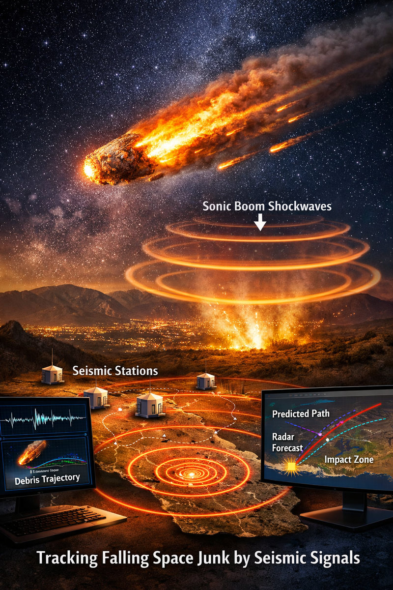 Ночное небо редко предупреждает. Оно просто принимает на себя след — огненный, быстрый, почти бесшумный для человеческого уха. Но в апреле 2024 года над Южной Калифорнией этот след оказался слышен иначе: его «услышала» Земля. В тот вечер фрагменты орбитального модуля китайской миссии Shenzhou 15 входили в атмосферу неконтролируемо. Светящиеся болиды прочертили небо — и тут же оставили после себя серию ударных волн. Их уловили не радары и не телескопы, а сеть сейсмостанций. Падающий с орбиты объект движется со скоростью, в десятки раз превышающей скорость звука. Воздух перед ним сжимается в мощную ударную волну — звуковой удар. Когда эта волна достигает поверхности, сейсмометры фиксируют характерные колебания. В статье, опубликованной в журнале Science 22 января 2026 года, исследователи показали: по этим сигналам можно восстановить траекторию космического мусора с высокой точностью — постфактум и, потенциально, почти в реальном времени. Сейсмолог Бенджамин Фернандо и инженер Константин