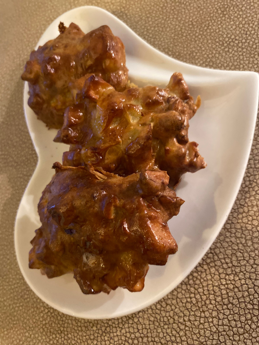 Взбиваем 2 яйца, режем кубиками яблоко, смешиваем все ингредиенты и выкладываем вилкой на пергамент.