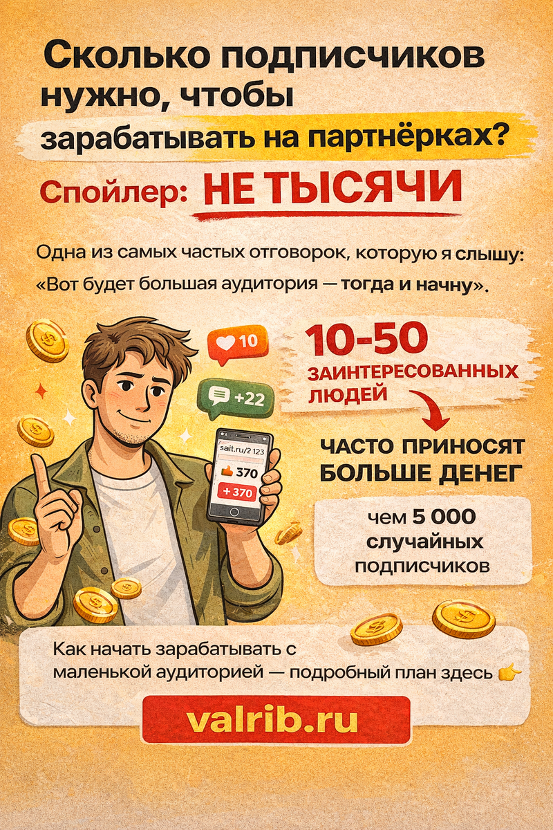 А первые деньги приходят с маленькой, но тёплой аудитории. Если вы всё ещё ждёте «когда вырастет канал» — возможно, вы просто откладываете старт.