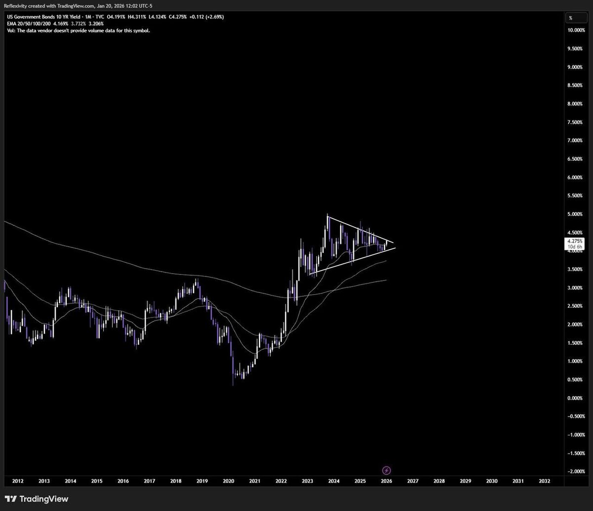 Смотрю на длинные доходности США — и ощущение, что рынок затаил дыхание. Многолетний график выглядит так, будто его кто-то стянул ремнём: ни вверх, ни вниз. Просто напряжение. Для новичка это можно упростить так. Есть облигации США. Их доходность — это по сути цена денег во времени. Когда доходности растут — деньги дорогие, риск не любят. Когда падают — деньги дешёвые, риск приветствуется. А сейчас они… застряли. Это значит, что рынок не понимает, во что верить: — инфляция вроде не побеждена — долги огромные — экономику резко ломать нельзя — печатать бесконечно тоже страшно В такие моменты рынок перестаёт выбирать «доходность». Он выбирает спокойствие. И тут становится видно странное: за последний год золото сильно выросло относительно облигаций, а биткоин — наоборот, просел. Для многих это звучит как парадокс. Но если убрать эмоции, логика простая. Золото — это актив без условий. Ему не нужен брокер. Ему не нужна ликвидность рынка. Ему всё равно, какие завтра будут ставки. Би