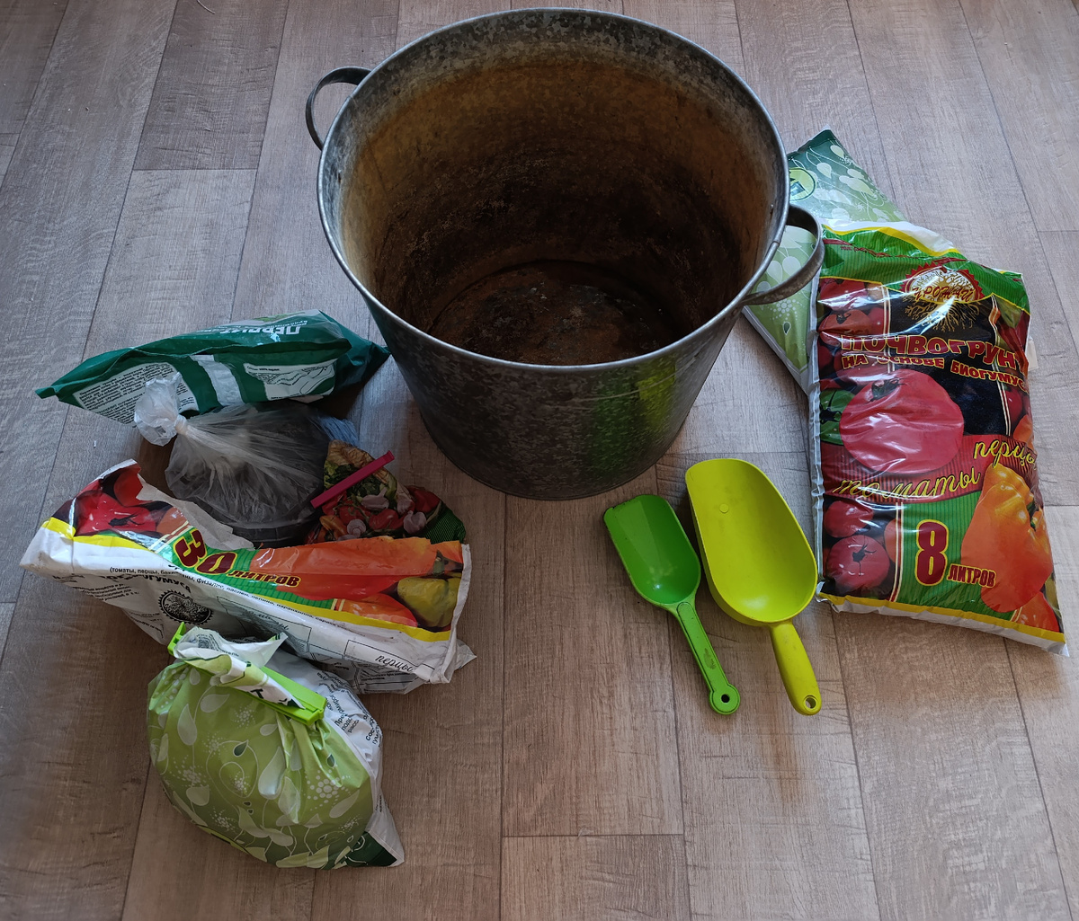 Прямо с утра, в предвкушении потирая лапки, я занялась замесом грунта. Вытащила всё, что у меня есть. Два невскрытых пакета 5 и 8 литров и различные остатки. В качестве добавки пошли вермикулит (тоже остатки) с перлитом. Перлит я основательно промочила, чтоб не пылил, а вермикулит просто осторожно сыпала. Замешивала потихоньку, добавляя грунт и добавки постепенно. И вымесила всё до однородности. Так вкусно на вид получилось - хоть на хлеб намазывай! Но это ещё не всё. Туда же я высыпала пакетик сухого "Фитоспорина". И тоже тщательно его вмесила. Пусть бактерии начинают работать во влажной и тёплой среде. После чего тщательно закрыла поверхность пакетом, чтоб грунт не пересыхал и оставила ёмкость в квартире, на балкон обратно не вынесла. Там сейчас сильно холодно, особенно на полу. За бортом минус тридцать, всё же. Всё. К посеву готова! Для того, чтобы убедиться, что грунт в порядке, набрала его в маленький стаканчик и посадила туда кабачковое семя. Недавно прочитала про такой способ пр