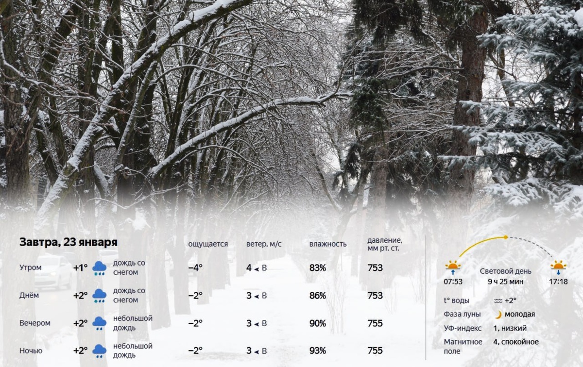 Завтра, 23 января, в Краснодаре ожидается сырая и прохладная погода с осадками. Утром около +1°, дождь со снегом и восточный ветер. Днём температура повысится до +2°, осадки сохранятся. Вечером и ночью ожидается небольшой дождь, температура останется в пределах +2°. Световой день продлится 9 часов 25 минут, восход в 07:53, закат в 17:18. Температура воды +2°, УФ-индекс низкий, магнитное поле спокойное. Подробнее: https://краснодарскийкрай.рф/news/prognoz-pogody-v-krasnodare-na-23-janvarja-2026-goda.html Прогноз погоды на неделю: https://краснодарскийкрай.рф/pages/weather-forecast.html #погода #прогнозпогоды #температура #осадки #ветер #климат #метеопрогноз #краснодар #краснодарскийкрай