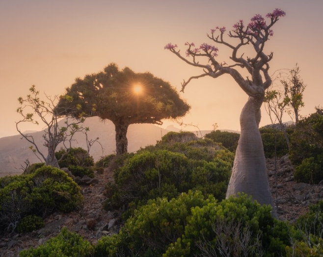 Ещё одно чудо острова — бутылочное дерево, или дискория. Оно напоминает гигантскую луковицу, утыканную тонкими ветками. Толстый ствол накапливает воду — это природный резервуар, помогающий растению выжить в жарком климате. Листья дискории служат кормом для животных, а во время цветения дерево покрывается нежными розовыми цветами, превращая скалистые склоны в цветущий сад посреди пустыни.