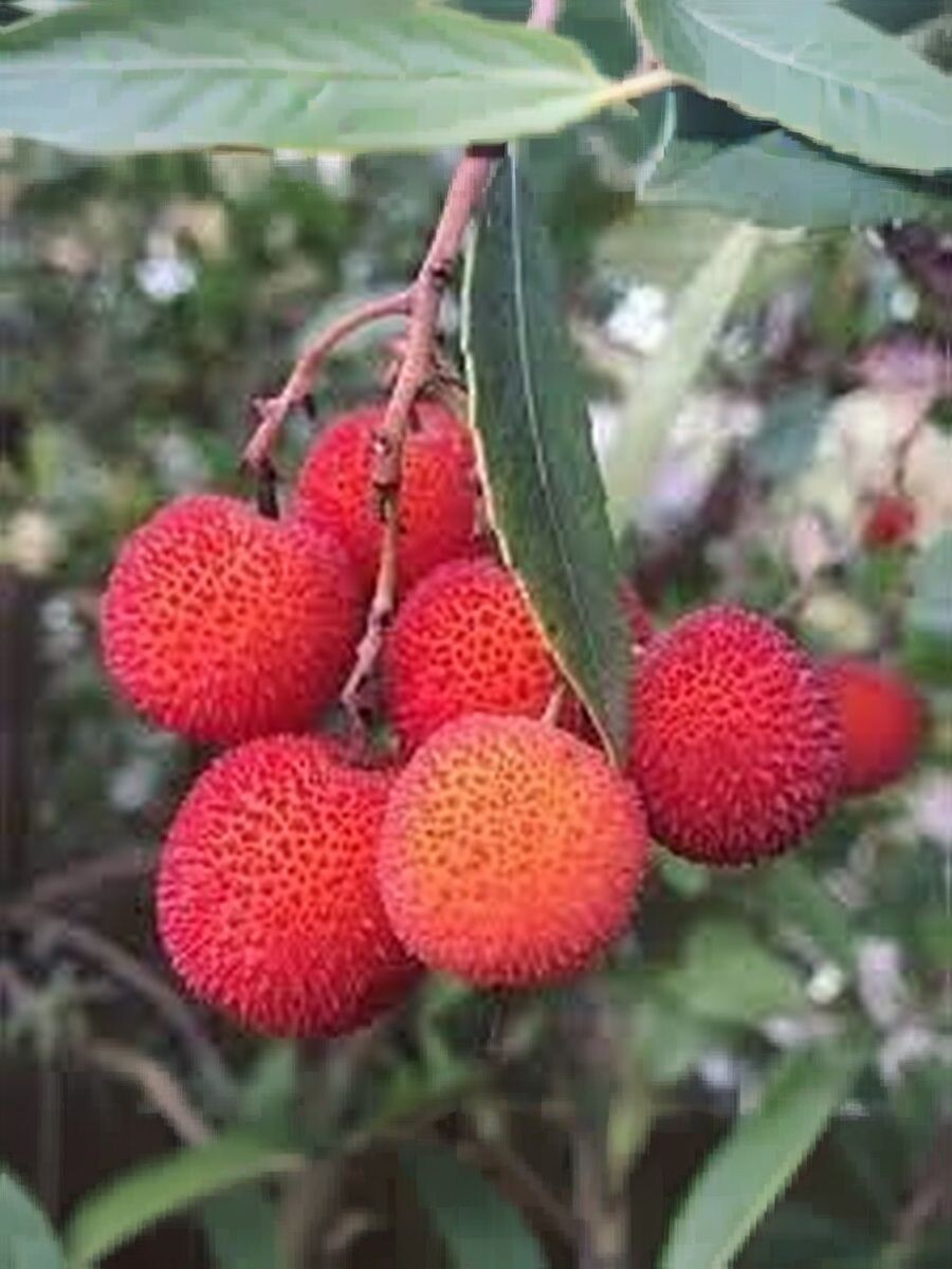 - Плоды: Самая узнаваемая черта Арбутуса обыкновенного – его плоды. Они появляются осенью, одновременно с цветами, что создает удивительное сочетание. Плоды, напоминающие ягоды, имеют шаровидную форму и достигают в диаметре 1-3 сантиметров. Вначале они зеленые, затем становятся ярко-красными, а по мере созревания приобретают темно-красный или почти бордовый цвет. Поверхность плода покрыта мелкими бугорками, что и дало растению название "земляничное дерево". Внутри плода находится мякоть, которая на вкус сладкая, с легкой терпкостью, и содержит множество мелких семян.