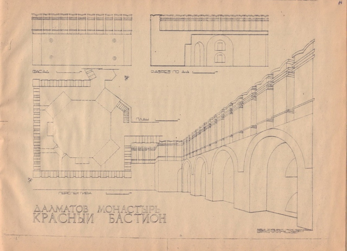 1973 г. Лист 14. Красный бастион Далматова монастыря (Фасад, разрез, план, перспектива) Источник: Музей архитектуры и дизайна Федерального государственного бюджетного образовательного учреждения высшего образования "Уральский государственный архитектурно-художественный университет имени Н.С. Алфёрова" #ДалматовМонастырь https://vk.cc/cTEAfn