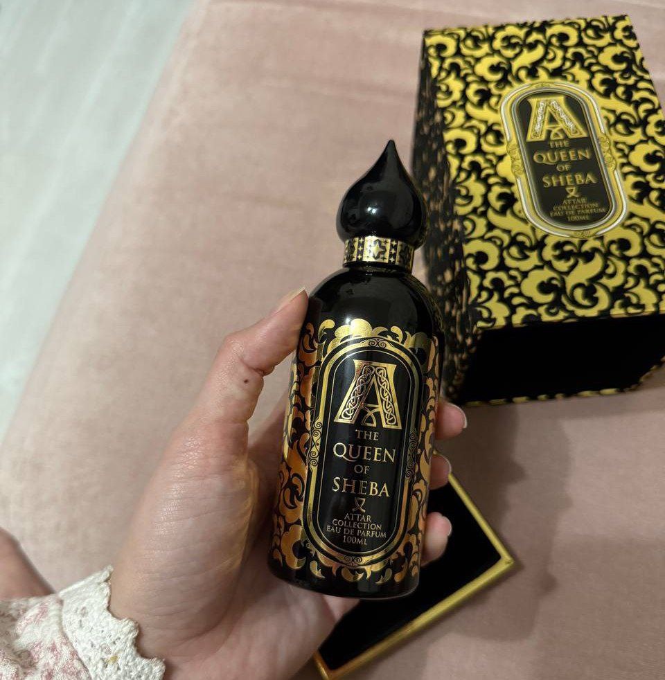 Здравствуйте, дорогие подписчики. Сегодня на обзоре у меня парфюмерная вода Queen of Sheba от Attar Collection. Я приобрела ее недавно и хочу детально разобрать этот аромат. Общее впечатление о флаконе - сдержанная монолитность. Упаковка черная, картонная, с золотым тиснением. Флакон выглядит дорого и современно. Интересно, что такая строгая геометрия хорошо отражает характер самого аромата - он такой же четко очерченный и структурный. Queen of Sheba - это концентрированный восточный парфюм. Его основа - пряности, густая роза и древесина. Аромат плотный, теплый, создан для холодного времени года. При первом знакомстве он сразу дает понять, что создан для тех, кто ценит глубокие, многогранные ароматы. Разбор нот. Начало. Верхние ноты нестандартны и сразу задают драматичный тон. Персик здесь не сочный, а скорее сушеный, вареньистый. Его сразу окутывают дым ладана и сухой, благородный запах табачного листа. Османтус добавляет тонкую, кожистую, чуть фруктовую пудровость. Развитие. Серд
