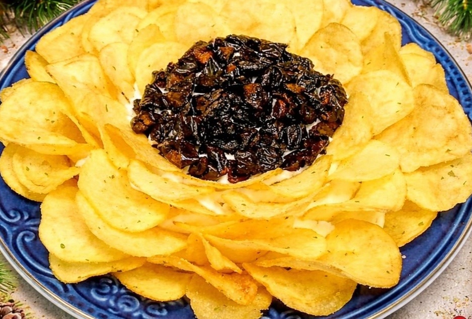 Копчёную куриную грудку нарезаем небольшими кубиками. Выкладываем на тарелку с широкими краями. Добавляем 1 ст. л. майонеза и аккуратно перемешиваем.