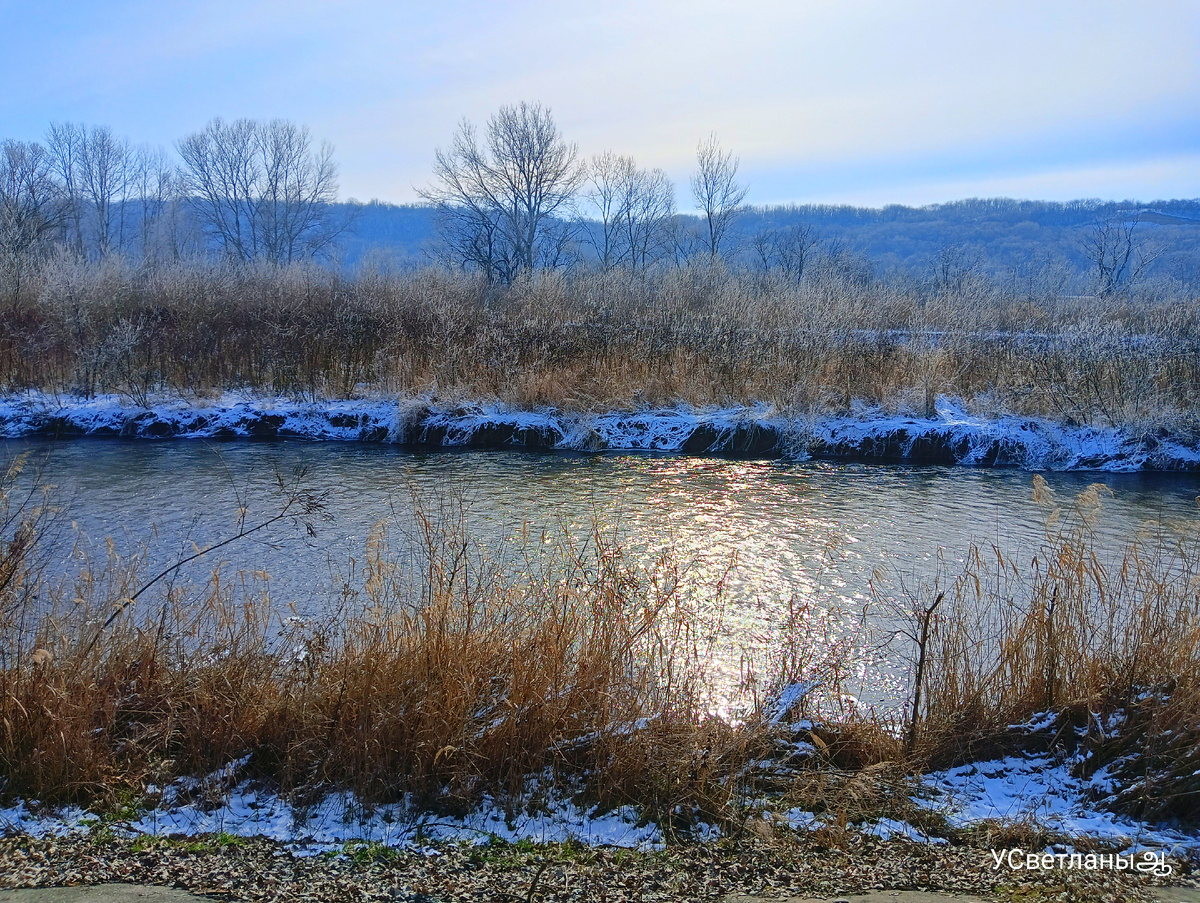 Спустилась ближе к реке, показать вам насколько чистая вода в ней сегодня. У берега над водой очень тонкий слой льда, словно из хрусталя.