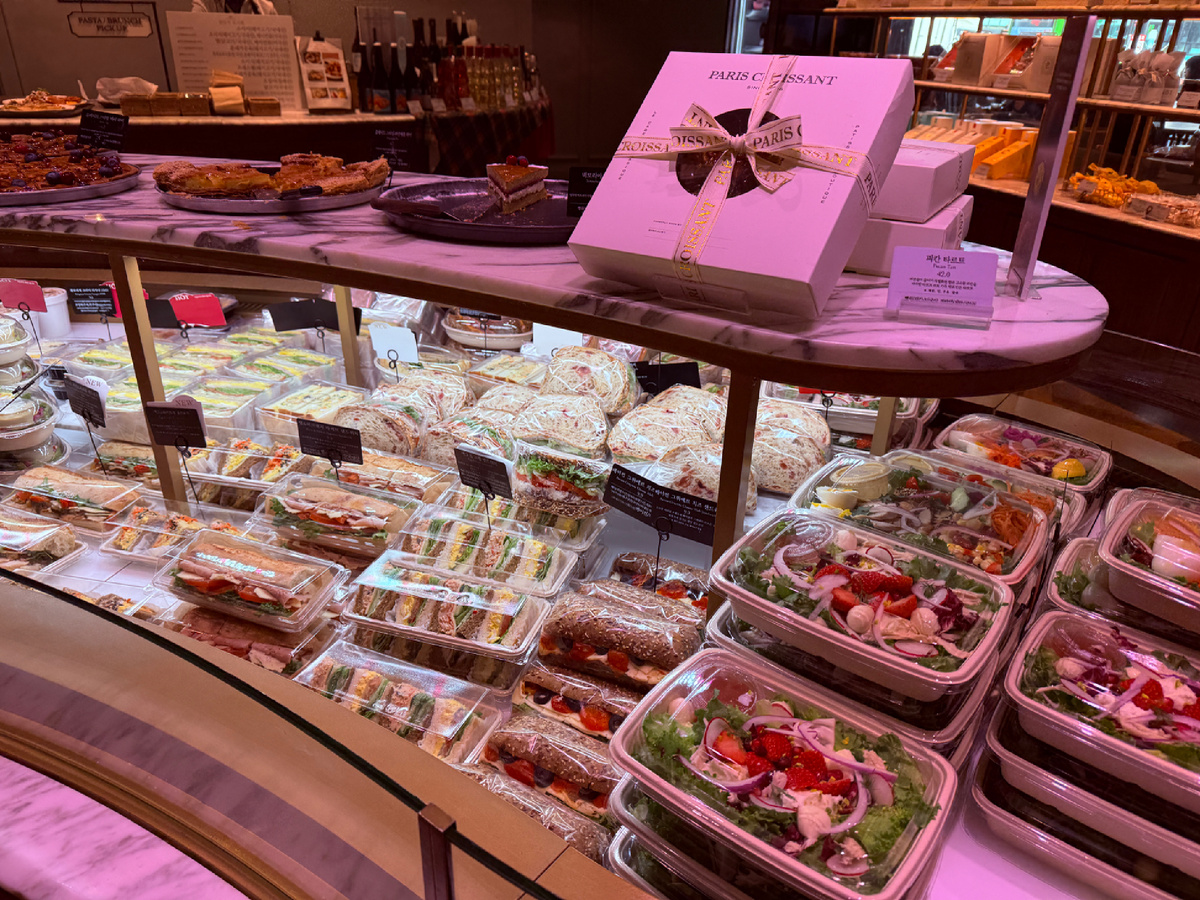 Организовано в бистро все по любимому корейскому принципу: в середине помещения стоят витрины с выпечкой и готовыми блюдами в контейнерах, есть витрина с упакованными изделиями (печенье, кексы, конфеты) и прилавок, где можно заказать еду, например, омлет, или пасту, и витрина с десертами. Есть и прилавок с вином.