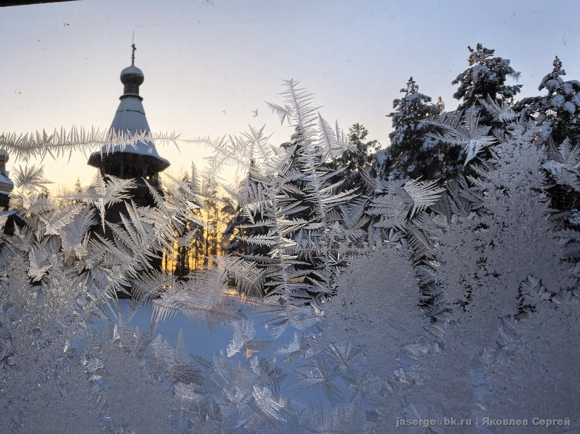 Градусник показывает - 25 (но по ощущения - 36). Окна в музее деревянного зодчества "Малые Корелы" раскрасились морозными узорами. В музее сегодня пусто: две группы стойких туристов и съемочная группа 1-го канала. Но именно в такие дни это место особенно прекрасно. А 6 лет назад мы с Василием были одни в музее, тогда доходило до - 40